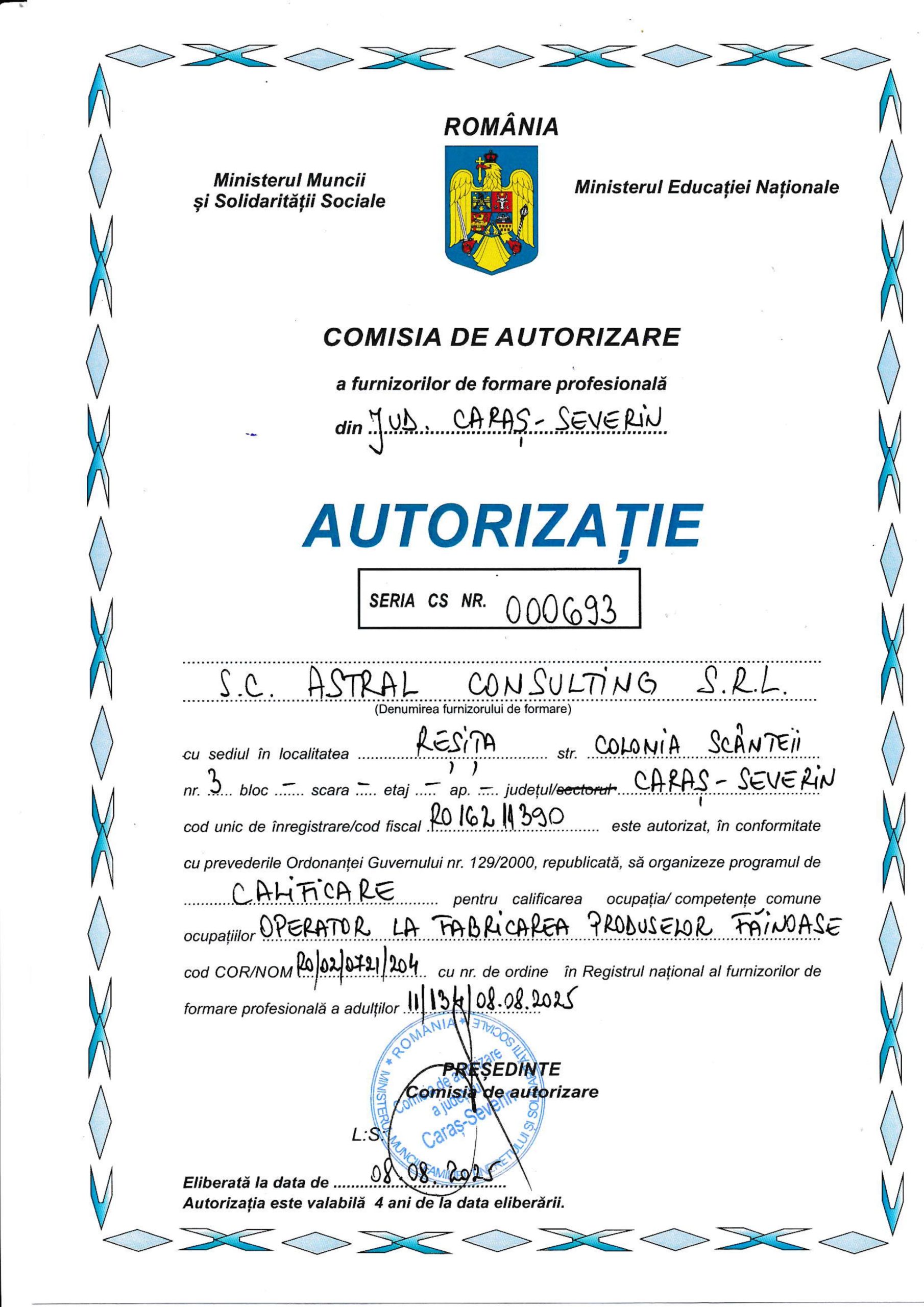 Autorizare cursuri calificare brutar, patiser, produse făinoase